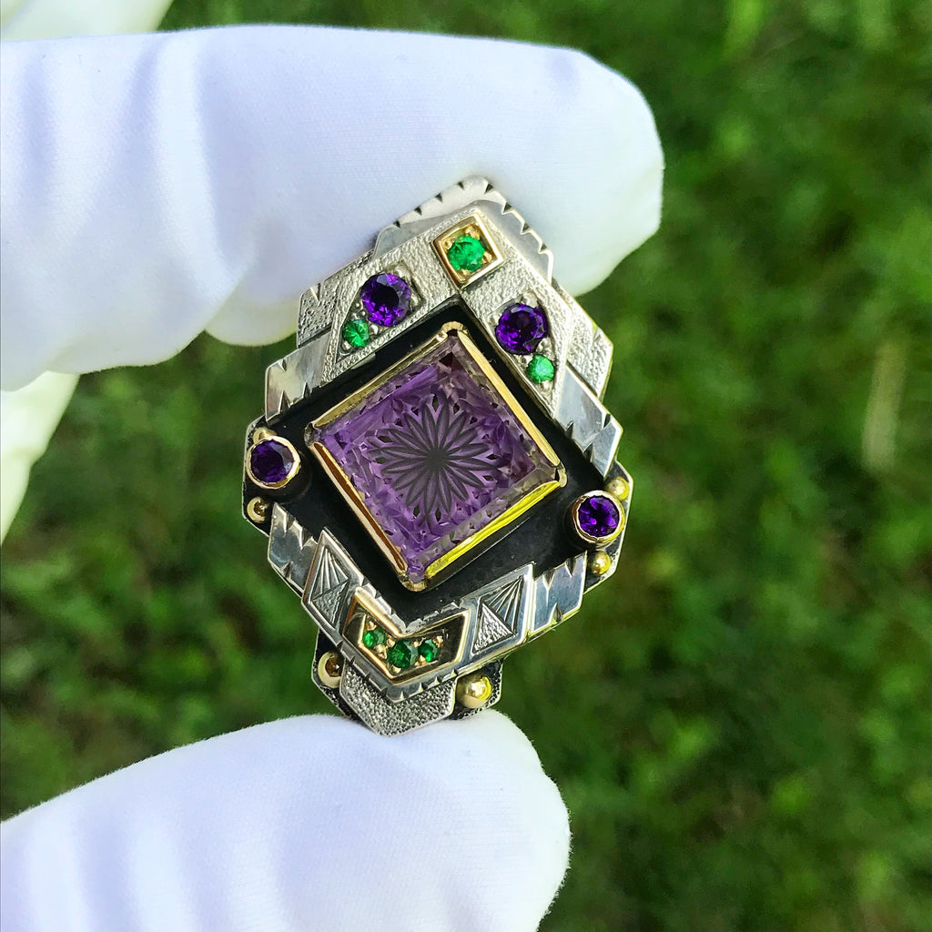 Accented wirh amethyst and tsavorite garnets. Constructed using 14k gold, silver, and 18k yellow gold.